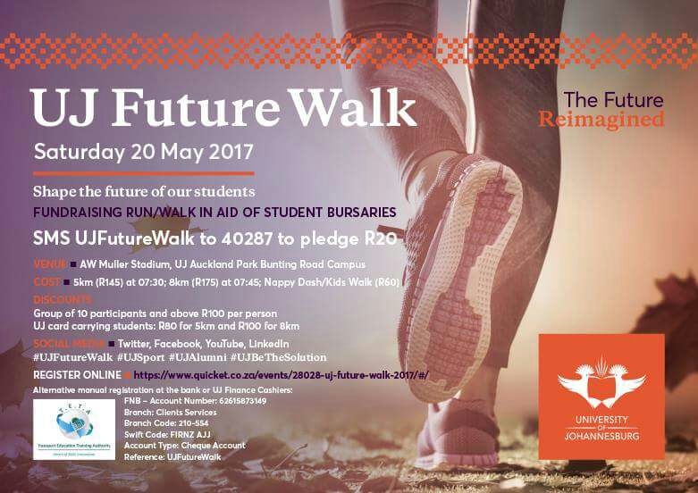 The University Of Johannesburg (UJ) together with Transport Education Training Authority (TETA) will this year stage the annual walk/run in Johannesburg on 20 May 2017 to again help students with funds.